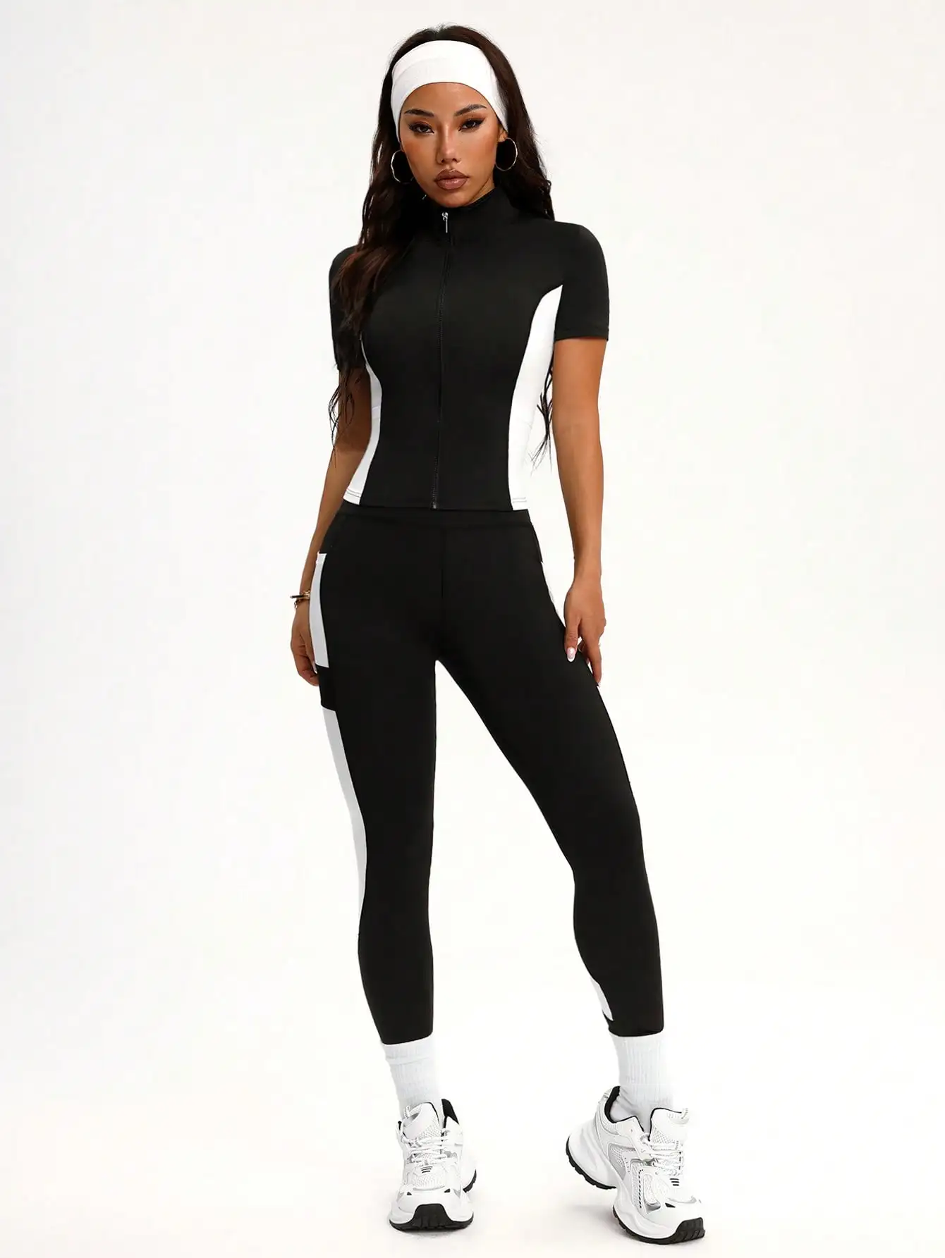 Step into sleek performance style with this colorblock zip-up activewear set. Featuring bold black-and-white paneling, a stand collar, and a full front zipper, this matching outfit delivers a modern athletic look with functional comfort. Mesh inserts add breathability, while the fitted shorts provide flexible support—perfect for workouts, gym sessions, or sporty streetwear styling.