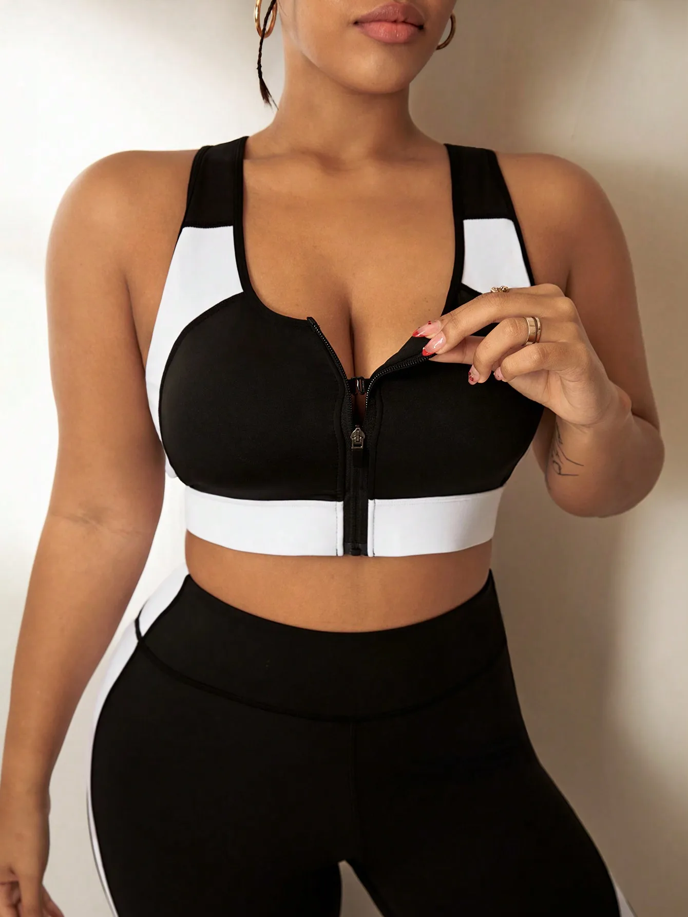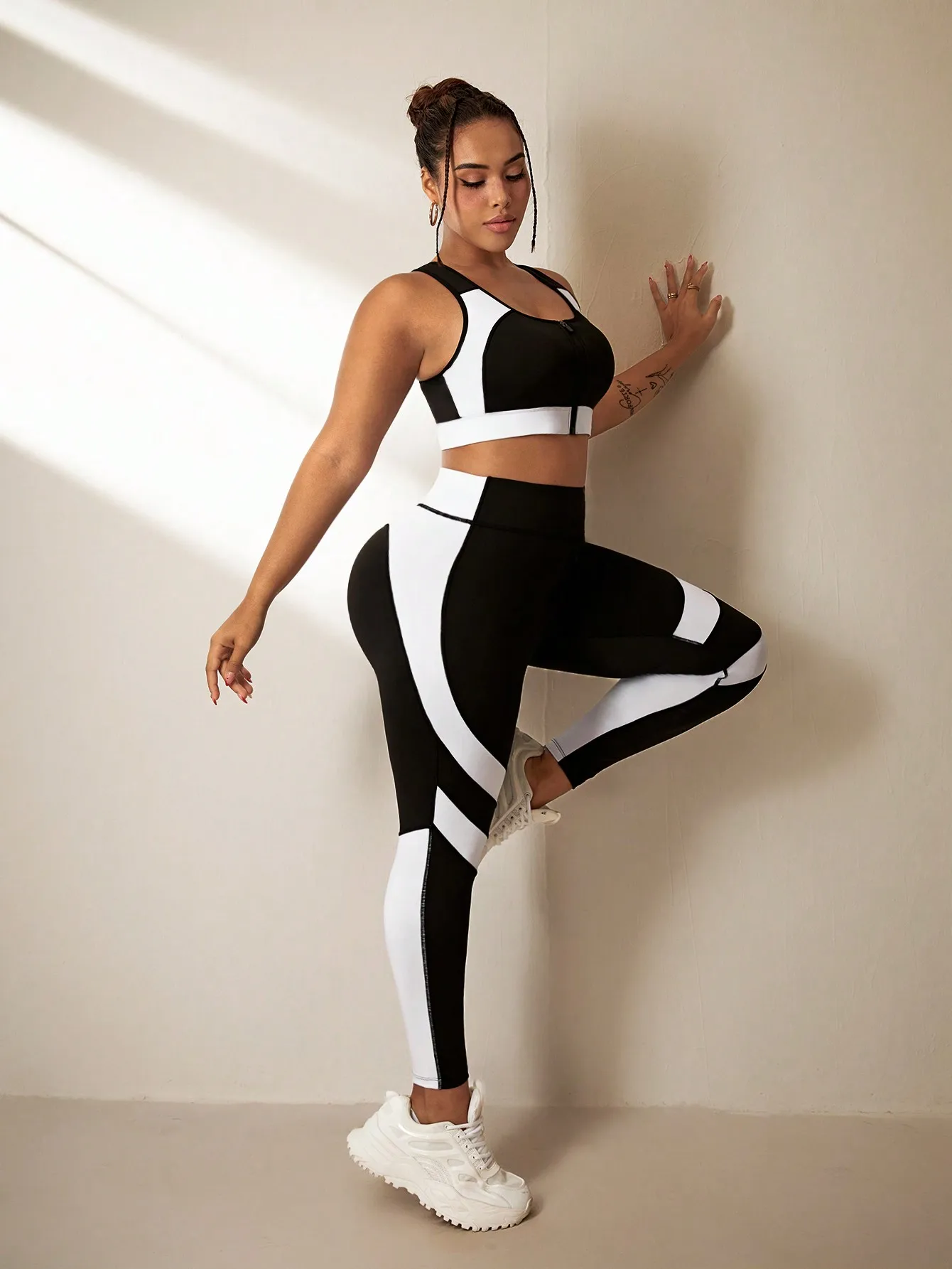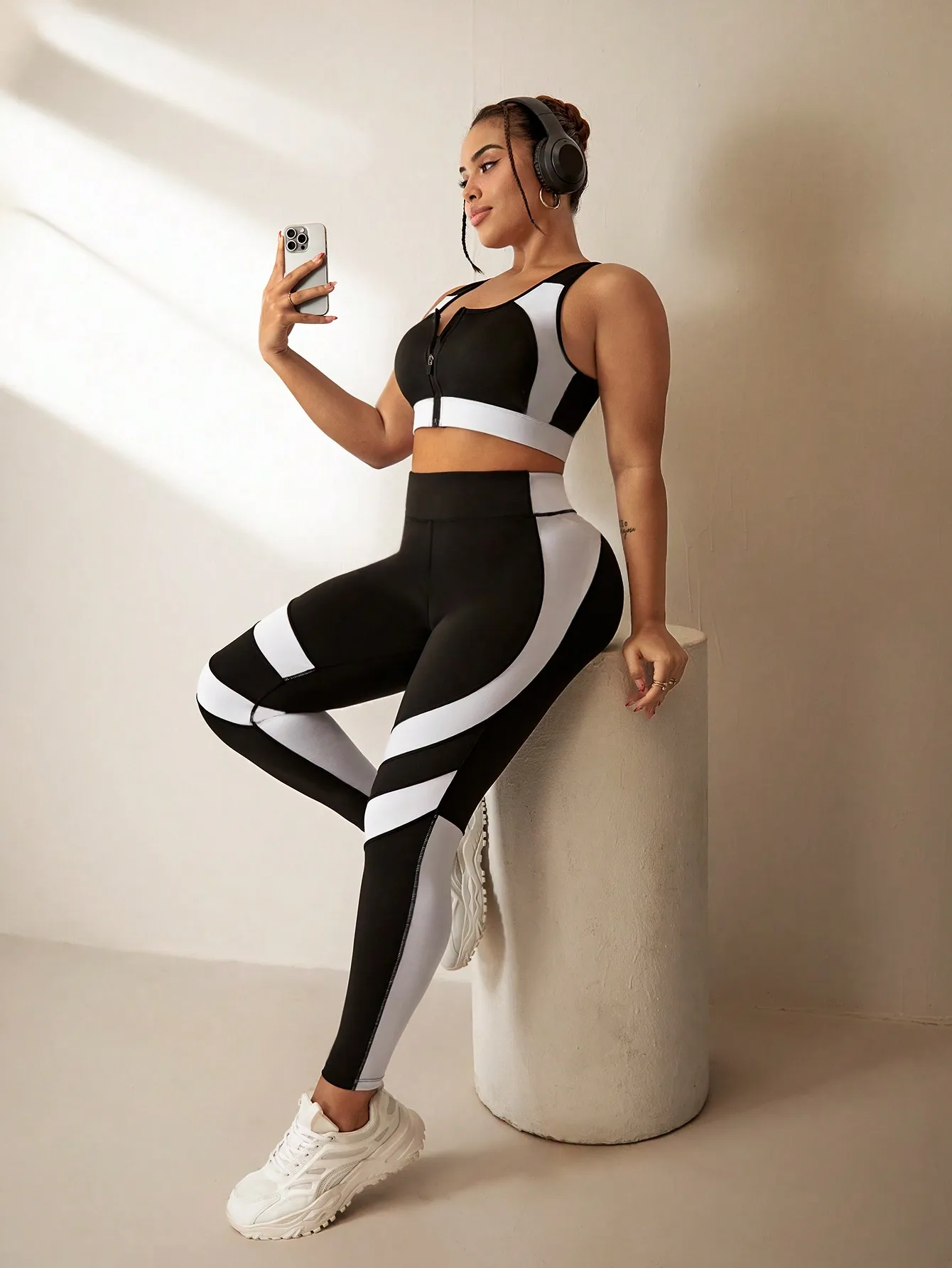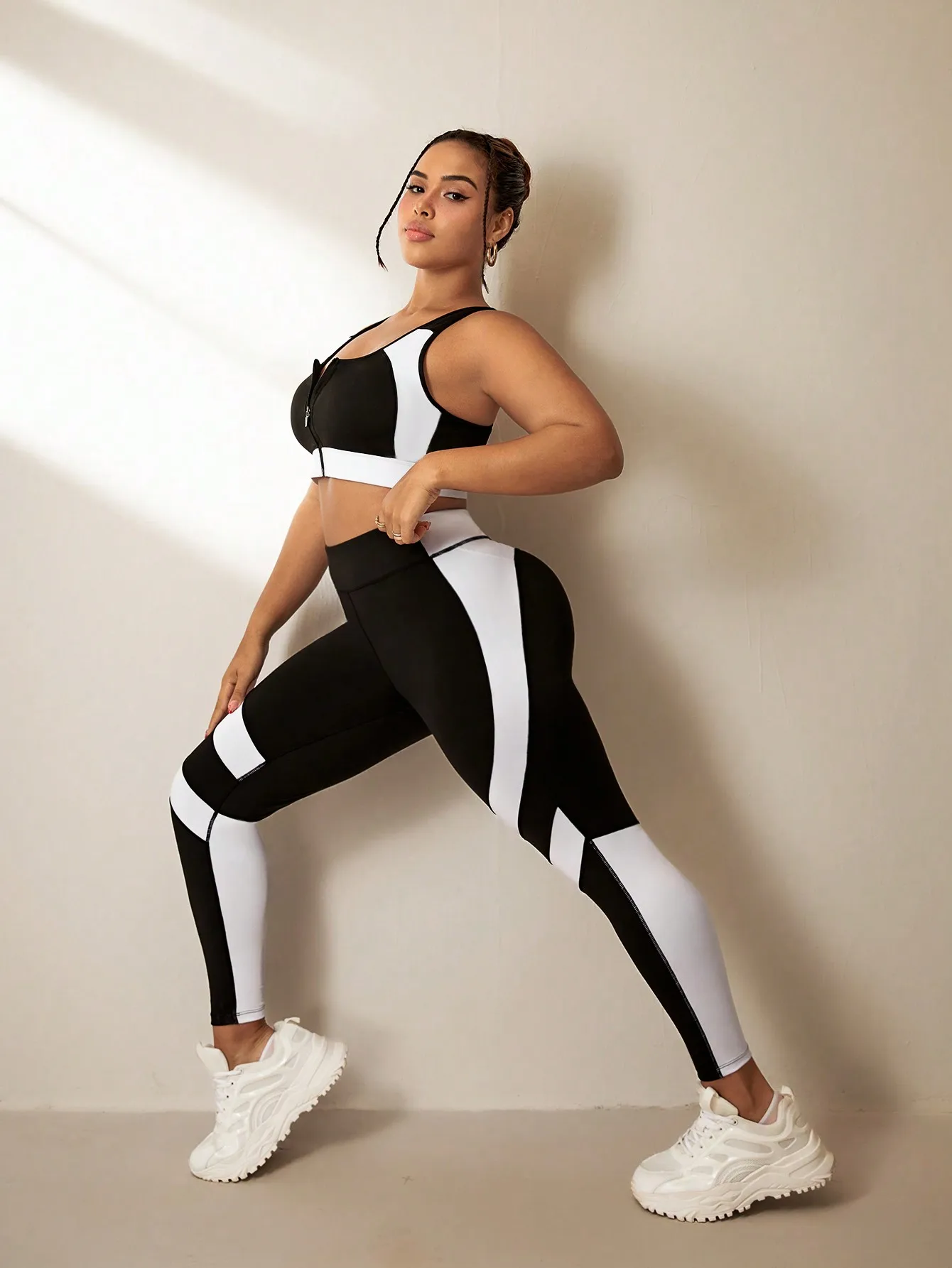 Step into confidence with this plus-size color block activewear set. Featuring a sleek black-and-white zip-up sports bra and matching high-waisted leggings, this two-piece outfit delivers modern style with supportive comfort. The curve-enhancing fitted silhouette and stretchy knit fabric make it perfect for gym workouts, yoga sessions, or everyday athleisure wear.