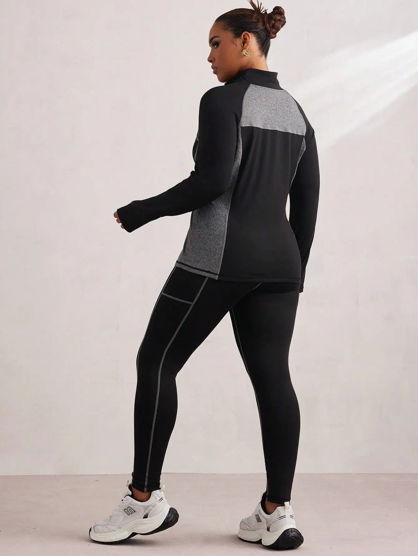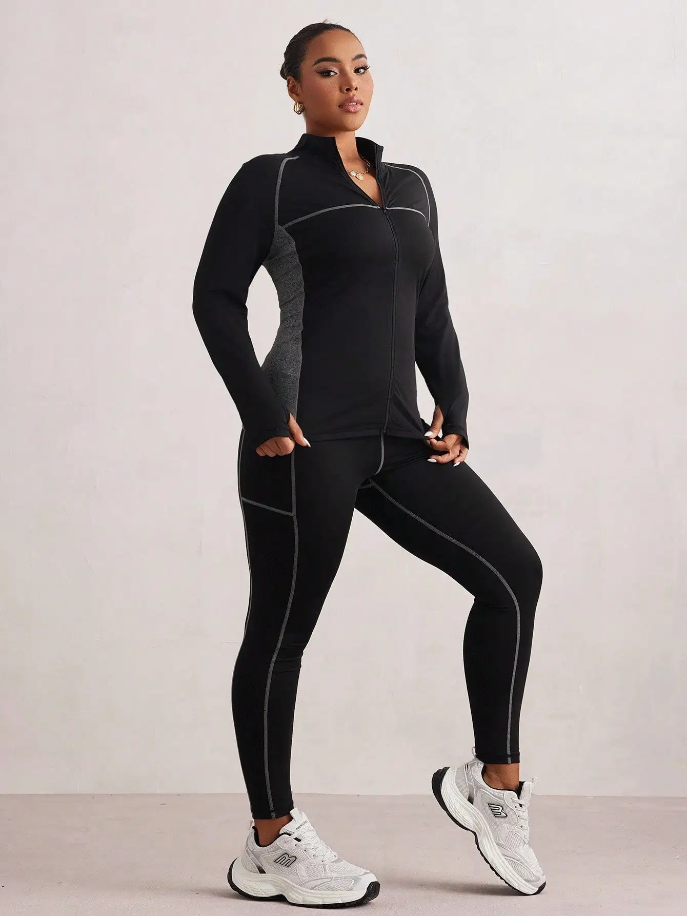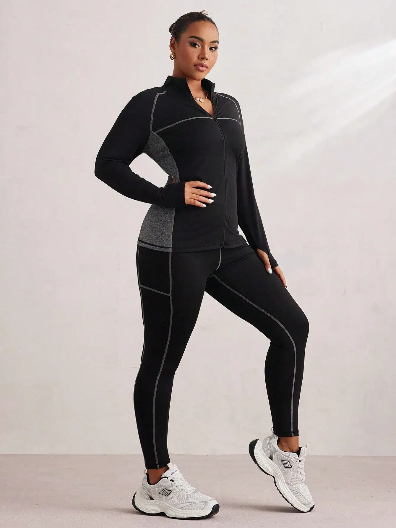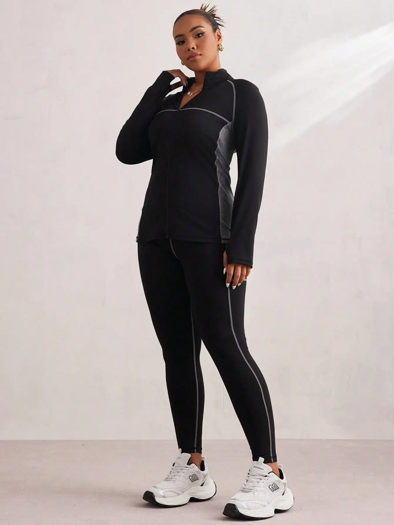 Stay confident and comfortable in this plus-size color block activewear set. Featuring a long sleeve zip-up jacket with bold panel detailing and matching high-waisted leggings, this set is designed to move with you through workouts or everyday wear. The sleek black base with gray accents adds modern athletic style while providing a flattering, supportive fit.