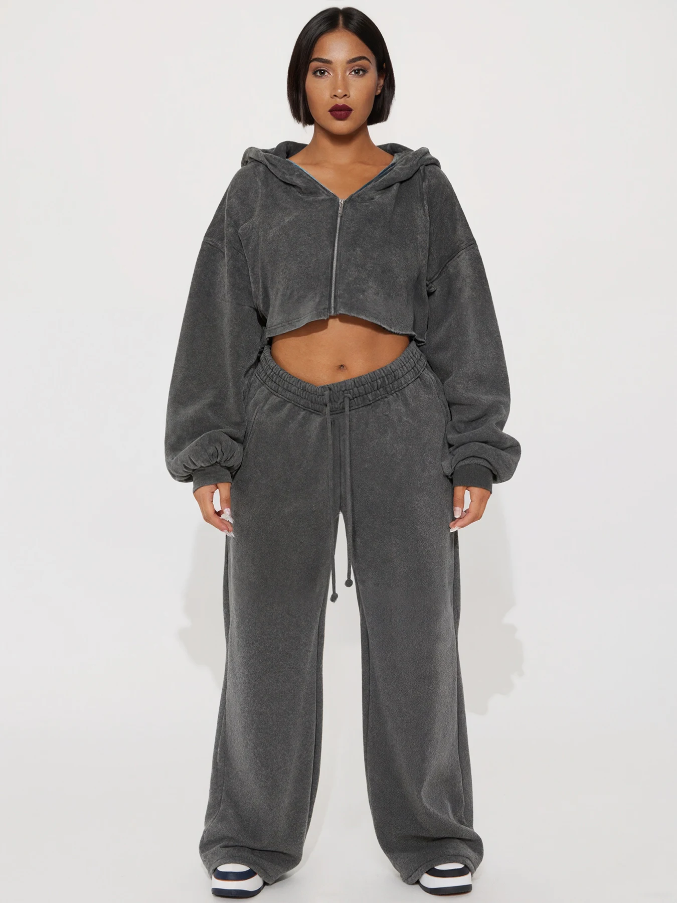 Style: Two-piece zip-up hoodie and joggers set Material: Soft, breathable fabric Fit Feature: Relaxed fit for hoodie and joggers Use: Casual wear, light workouts, lounging |