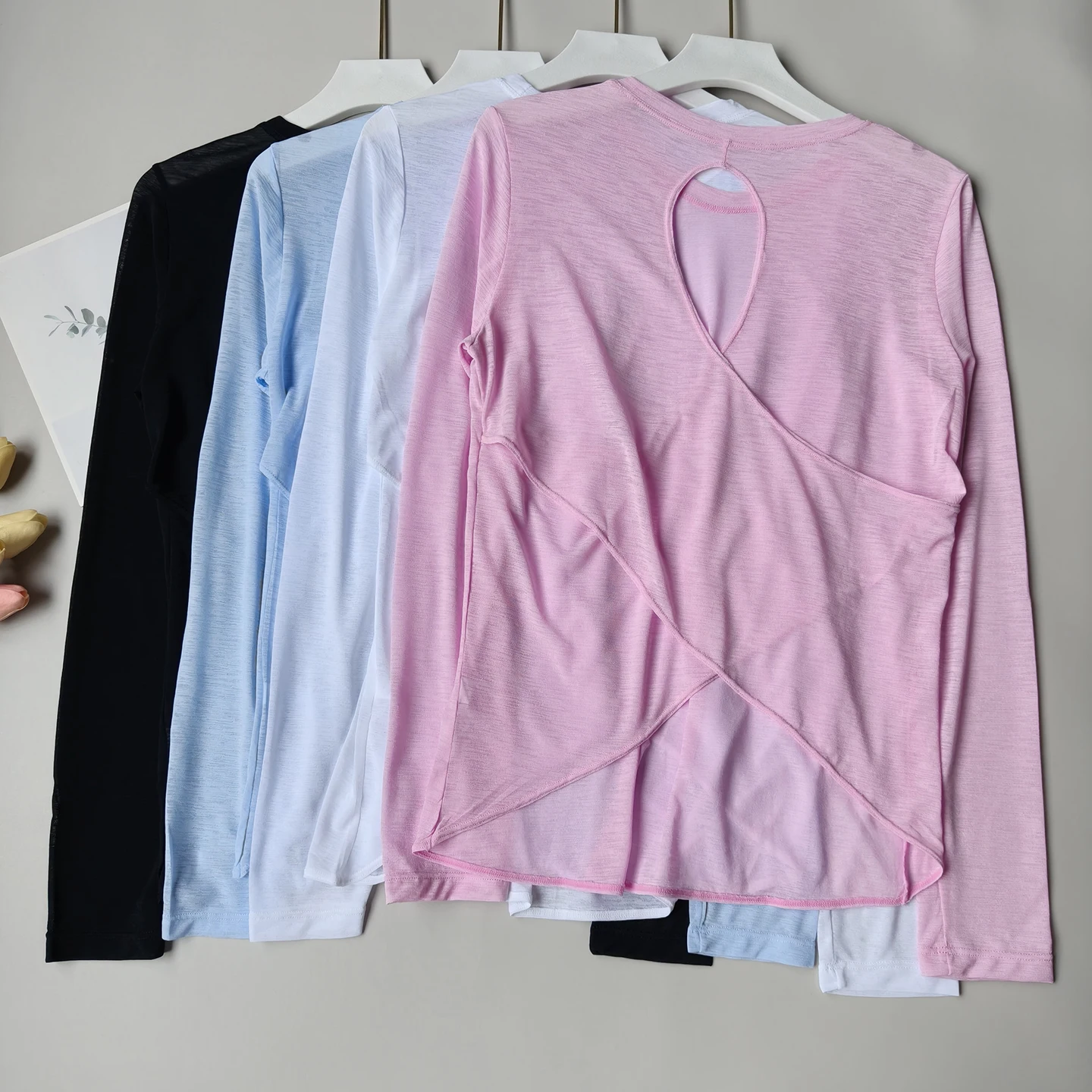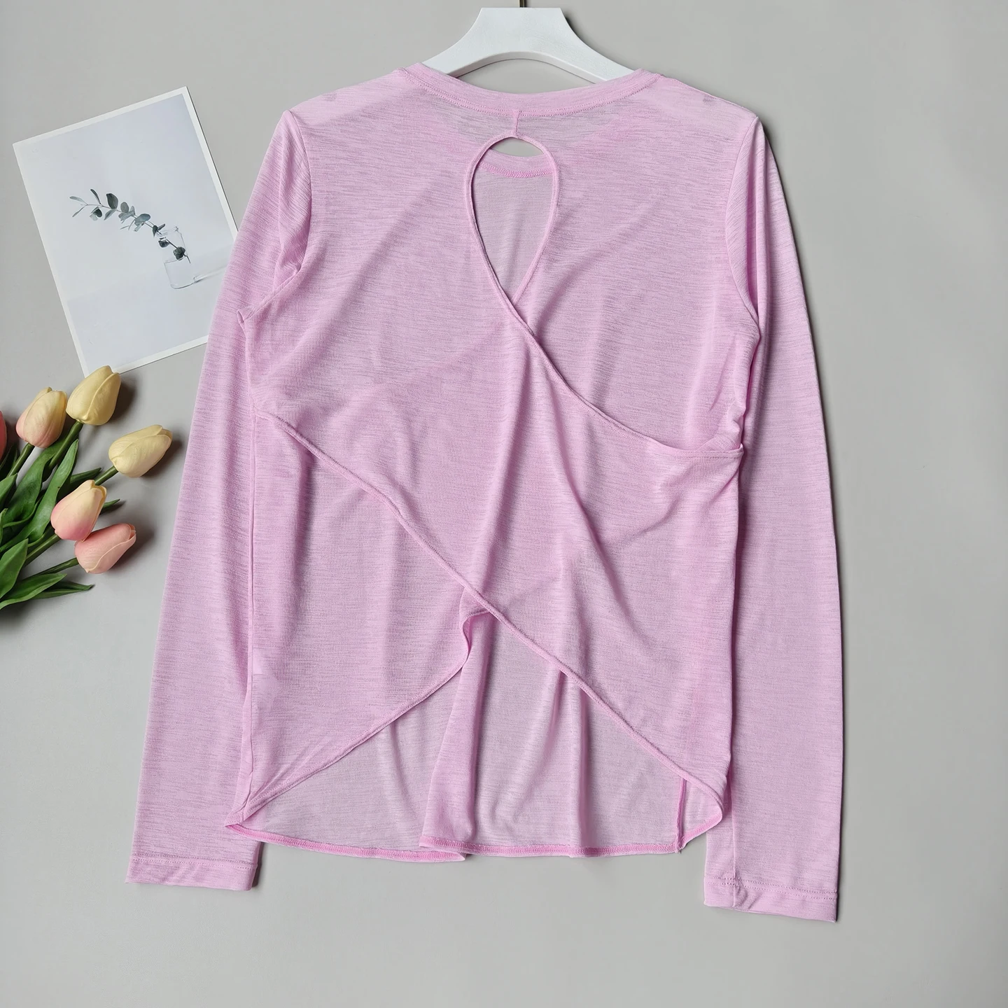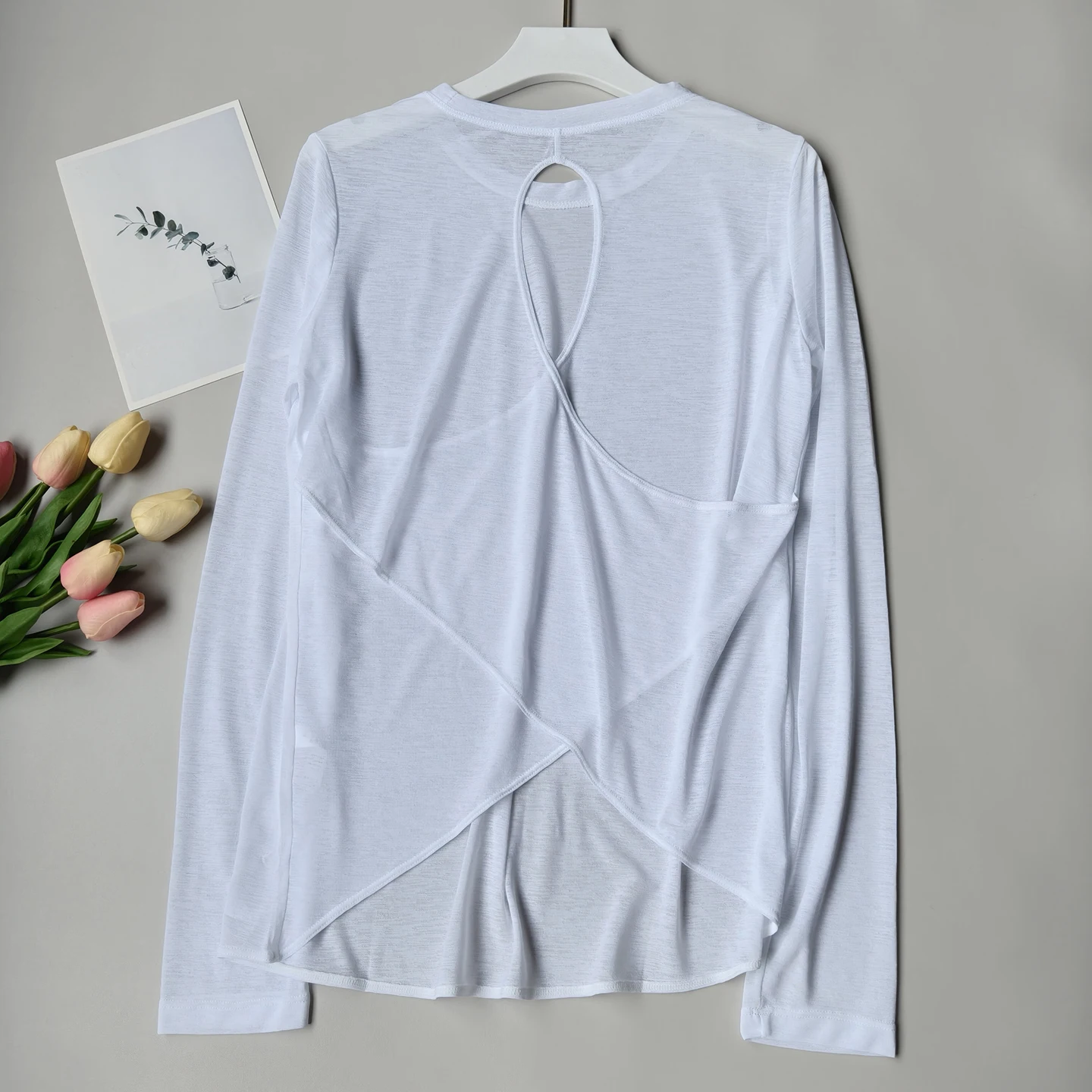 Designed with a relaxed fit and an open back detail, this lightweight long sleeve top provides maximum breathability while allowing full freedom of movement. The classic round collar and sporty silhouette make it perfect for yoga, gym sessions, pilates, or casual athleisure wear.